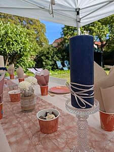Här är ett exempel på dukning och dekoration till ett mindre privat event som hölls i en trädgård. Jag planerade och ritade upp festplatsen med hjälp av bilder på föreslagna dekorationer, som kunden sedan godkände och jag gjorde inköpen.