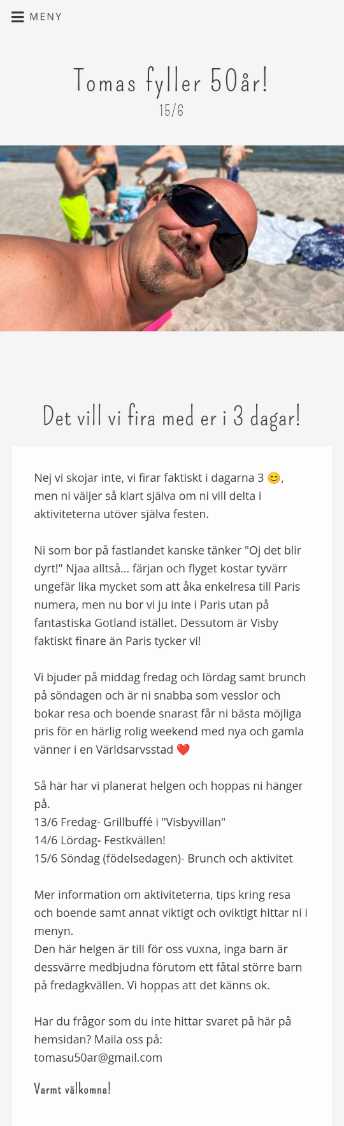 Det är mycket administration inblandat i större fester, event, konferenser och kick- offer. Jag har lång erfarenhet av eventplannering och ett av de verktyg som behövs för att det ska bli ett lyckat event är att se till att deltagare och gäster har lätt tillgång till all nödvändig information på ett tydligt och trevligt sätt. Dessutom behöver eventplaneraren ha ett enkelt vertyg för att kunna samla in nödvändig information om deltagare och gäster. Här är ett exempel på en 3- dagarsfest som jag planerade från starten (OSA- knapparna är avstängda).